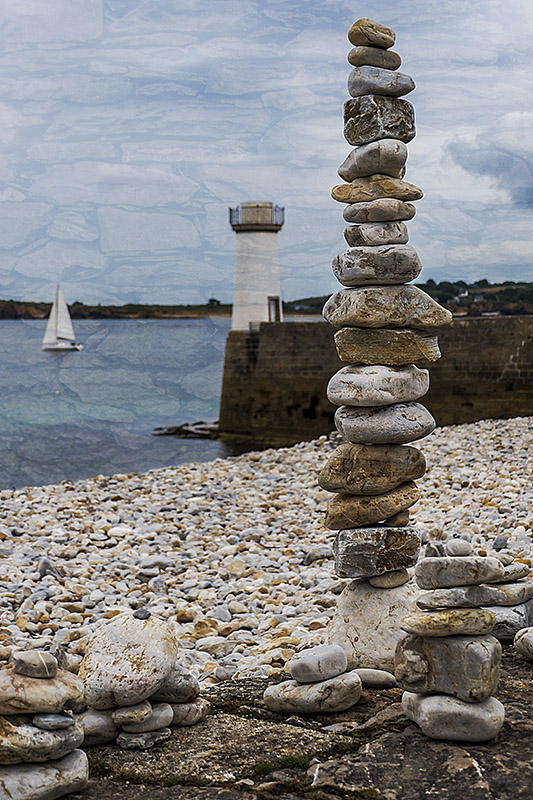 Hoy es muy común ver estas columnas de piedra en equilibrio en cualquier parte costera que posea cantos en abundancia. En esta localidad bretona había muchísimos, y éste me llamó la atención por su altura y su bien logrado equilibro, que más que simbolismo aluden a la habilidosa dificultad de crear estructuras donde reposar la vista. Como aportación probablemente innecesaria, añadí una textura al resto de la imagen donde no aparecían piedras