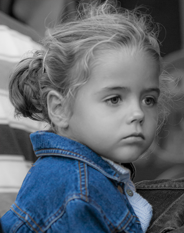Robado de una niña en un mercado medieval realizado en las fiestas de esa ciudad. No debía ser muy de su agrado, pues parecía que nada de lo que le rodeaba le interesara. Dicha actitud me sorprendió, y es lo que pretendí captar. Lamentablemente, el barullo de figuras y colores en el que nos hallábamos hizo precisa una desaturación parcial para resaltar mejor su lindo rostro pensativo