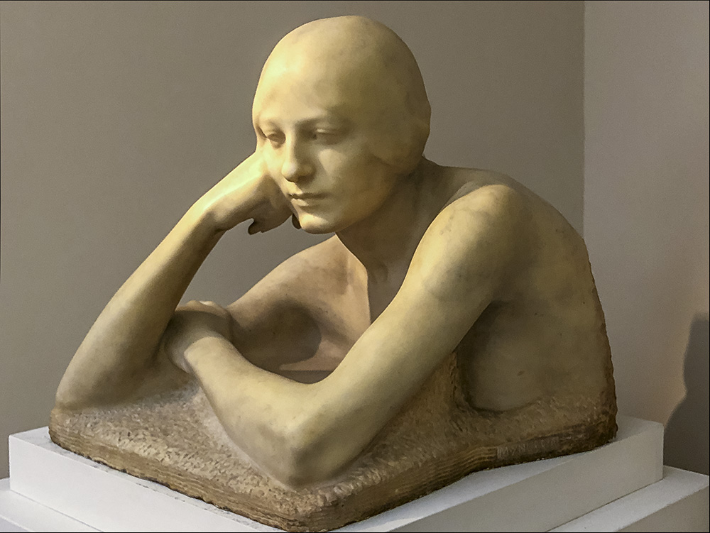 Esta delicada obra de madurez del escultor cordobés Mateo Inurria, realizada en mármol, y que apenas supera el medio metro en su lado más largo, supone su testamento artístico final, en el que se despoja de todo elemento accesorio, centrándose en lo esencial. La influencia del modernismo se aprecia en la línea tan fluida que parece hacer olvidar la dureza del material. Inurria, que no gustaba de los discursos, entregó esta obra a la Academia para suplir el que debía pronunciar cuando fue nombrado miembro de la misma en 1922. Mínima edición