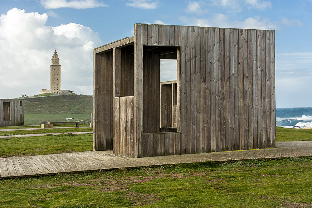 Los alrededores del único faro de origen romano en funcionamiento, la famosa Torre de Hércules, tiene en sus alrededores mucho que ofrecer tanto a nivel paisajístico (se halla en un tómbolo bien delimitado), sino también a nivel escultórico (Parque escultórico del entorno de la Torre de Hércules). Un lugar de estimulante paseo, sin duda. Lo que aquí se muestra es una de las dos casamatas de descanso que, junto a unos bancos de contemplación celeste se colocaron hace unos años en este entorno. Mínima edición