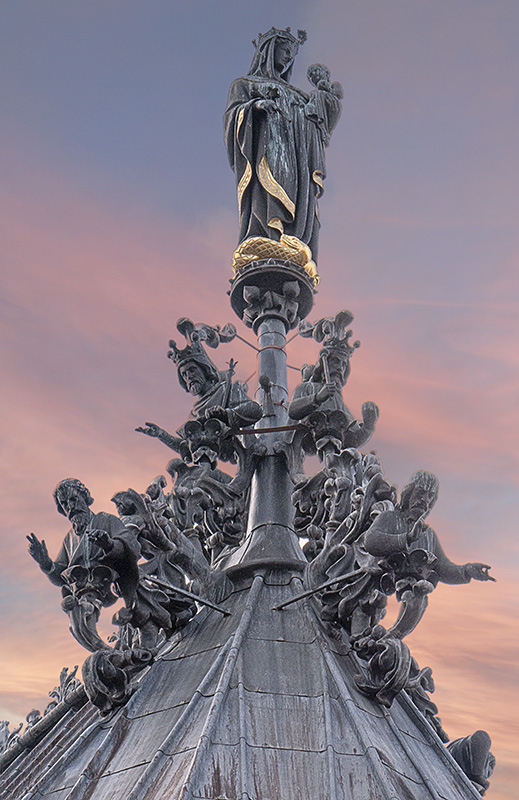 Concretamente, en el vértice donde convergen el tejado a dos aguas de la nave principal y el semicónico de la girola. Están representados la Virgen María (en bronce con sobredorados) y un grupo superior de 4 reyes y otro inferior de 4 personajes que bendicen desde lo alto (tal vez los evangelistas). Obviamente, el estilo, como el edificio, es gótico, aunque más avanzado en el tiempo que la construcción.Fotografía realizada con zoom 70-300 en condiciones de buena luz. El cielo era completamente blanco, por lo que fue sustituido por otro más acorde con el "mensaje" del grupo escultórico. A mayores, se aclararon las sombras y se potenció la estabilidad y el enfoque