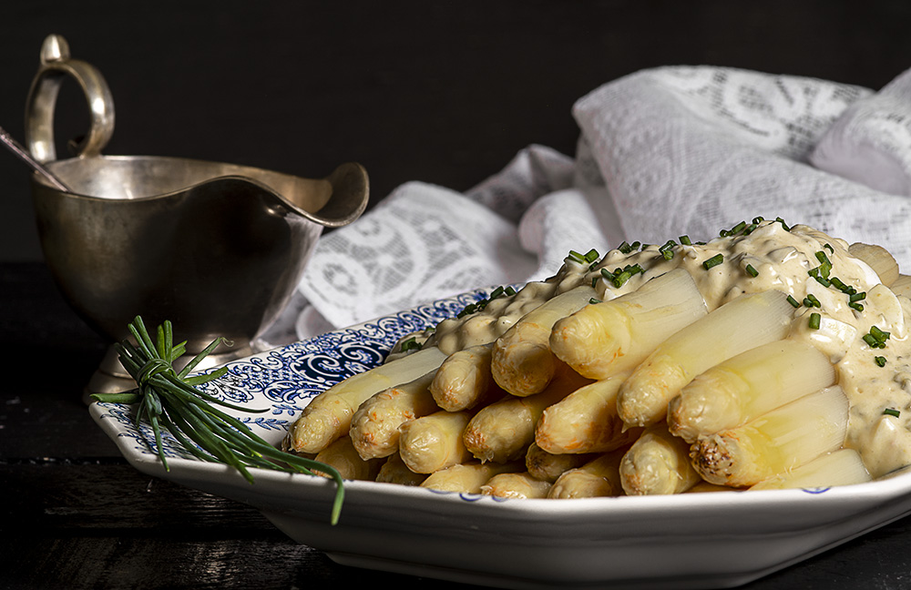 Uno de los populares platos de La Cocina de Frabisa, fotografiado "por mí" en un descanso de "su" sesión de fotos. A nivel técnico, no tiene ni añadidos ni sustracciones, ni nada extraordinario. Lo más interesante es que los espárragos no son de bote, sino naturales, comprados crudos en el mercado de Tudela (Navarra, España)