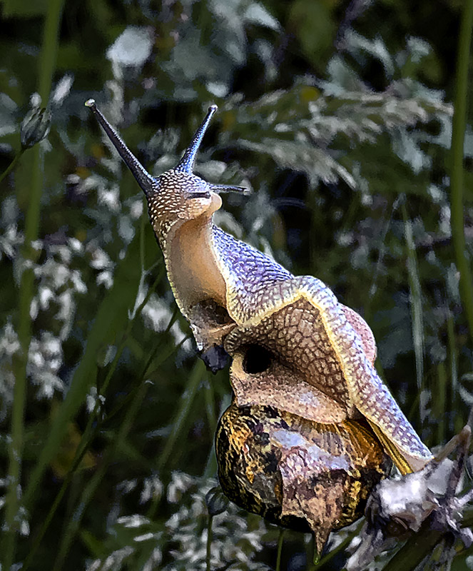 Me entretuve contemplando las evoluciones de un caracol, el cual me demostró que tienen una flexibilidad capaz de torsiones inverosímiles y que se desenvuelve a las mil maravillas, haya el obstáculo que haya. En esta toma parece estirarse para otear su próximo destino, al que se dirigiría a su ritmo: lento, pero seguro; siempre que atraviese espacio natural, porque si no, sus posibilidades se reducirían muchísimo. En la edición se desaturó parcialmente el fondo, para incidir en su protagonismo en la escena