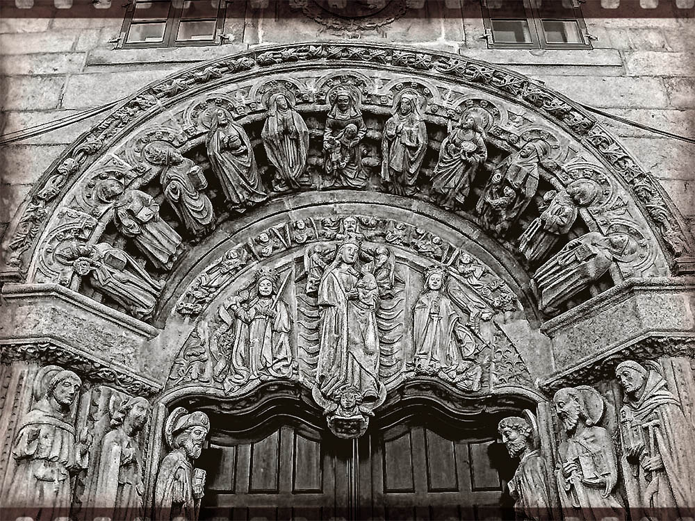 Esta soberbia fachada, con su tímpano, de finales del s. XV y claramente gótica, ha sido malinterpretada en su tipología y temporalidad. Se dijo que era muestra de la pervivencia en Santiago de modelos románicos procedentes del Maestro Mateo, cuando lo que había ocurrido es que se trasladó al nuevo edificio esta fachada del antiguo hospicio, que albergaba antes al Colegio de S. Jerónimo. En la edición, se pasó al B/N, se lo viró al sepia y se le añadió un marco "fotográfico"