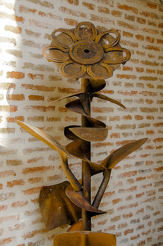 Obra perteneciente a una exposición temporal que se mostraba en el Castillo de Arévalo. Pertenecía a un autor, que realizaba sus obras como si fuera un puzzle de piezas de labranza, objetos rurales de hierro convenientemente oxidados, con los que formaba personajes, objetos, plantas o creaciones sorprendentes, plenas de imaginación. Lamentablemente, perdí la referencia del nombre de su autor. Seguro que alguien me ayuda con ello. Edición mínima
