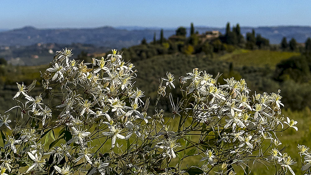 El paisaje de la Toscana es suave y ondulado, y abunda en cipreses (mi árbol favorito), pero a veces no es lo mejor de un lugar. Si en cambio le añadimos algo en primer plano -un macizo de flores, por ejemplo-, el protagonismo cambia, y la imagen también. Mínima edición