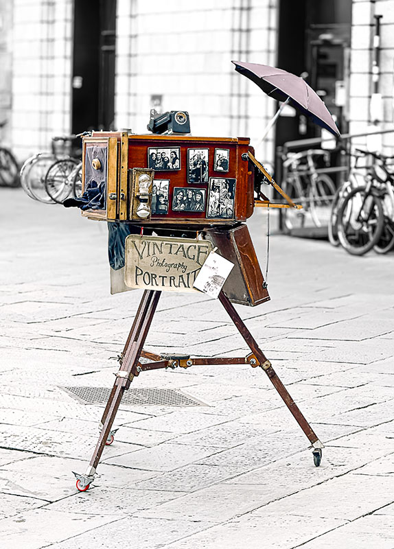 Siempre que veo una cámara de galería (también llamada de fuelle, o de velo) por la calle, no puedo evitar quedarme embobado mirándola, mientras imagino lo que ha avanzado la fotografía, sobre todo en los últimos 50 años. Bien es verdad que se nota sobre todo en unos aspectos -los técnicos- más que en otros -los estéticos-. Pero aun así es descomunal la diferencia entre este entrañable armatoste de varios kg de peso y el escaso cuarto de kilo que pesa mi móvil, que es ahora mi cámara de referencia. Con todo, qué nostálgica belleza transmiten estos aparatos a pesar de los años. En la edición se desaturó casi completamente el fondo, y se desenfocó el mismo para hacer destacar el objeto principal de la composición