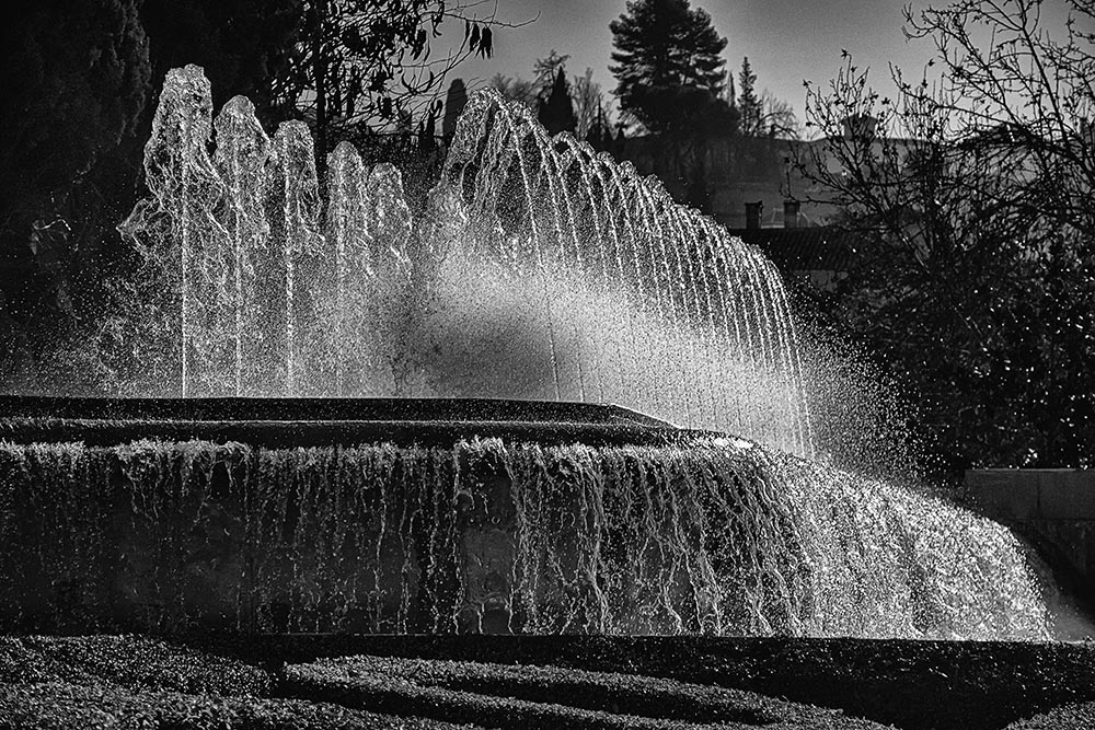 La granadina fuente de la Plaza del Triunfo mostraba unas líneas muy interesantes, que contribuí a micronizar con una velocidad de obturación muy alta, que congelaba el movimiento del agua. Lo de la edición en B/N es para que nos centremos en las formas y no en los colores