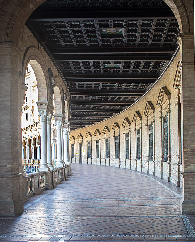 Galería superior del edificio principal de la sevillana Plaza de España. Es edificio historicista inaugurado en 1929, con motivo de la Exposición Iberoamericana. El ladrillo es omnipresente, pero los techos cuentan artesonados de madera que se sostienen con columnas de mármol. Aclarado de los oscuros techos, en la edición