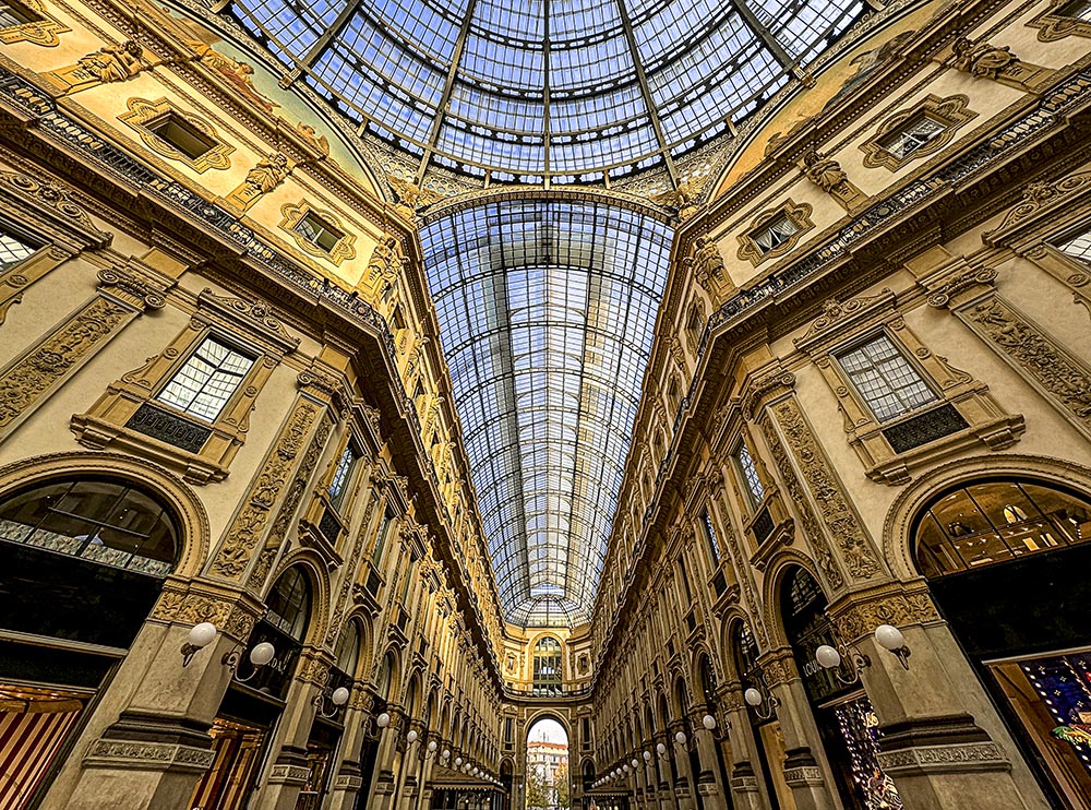 Meca de cualquier visitante de la capital económica italiana, sea amante del arte o no, porque en ella se ubican algunas de las firmas más afamadas del mundo de la moda y del lujo. No hay que olvidar que en su momento fue el precedente más avanzado del concepto de centro comercial acristalado y cerrado, al que tan acostumbrado estamos hoy día. Aquí ofrecemos la espectacularidad de las líneas de su techumbre de hierro y vidrio (cúpula rebajada y bóvedas de cañón), que corona un edificio de corte historicista, construido durante la unificación italiana. Mínima edición