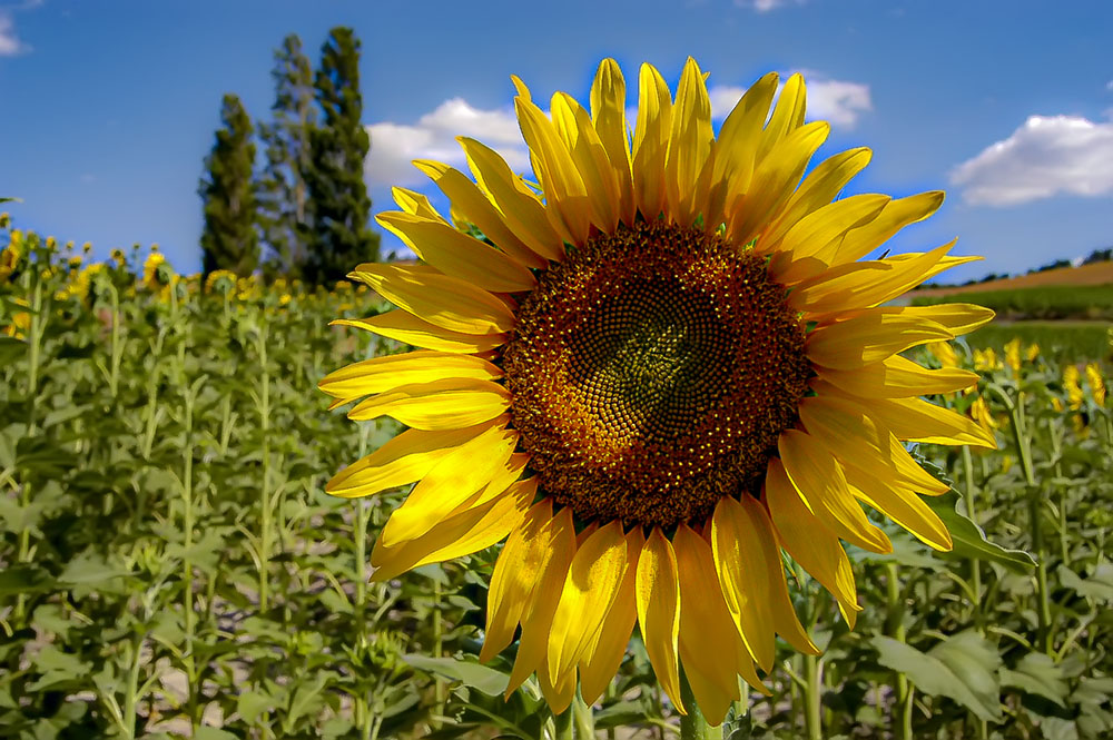 El girasol es una planta cuya parte superior es muy reconocible. También, muy fotogénica. Si uno se mete en un campo de girasoles, y busca composiciones, no le faltarán formas y motivos. Esta imagen es un buen ejemplo de ello. Mínima edición