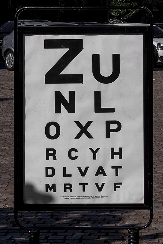 La letra pequeña, en la parte inferior, reza así: "Este test no médico, reservado a los mayores de 16 años, no dispensa de sus visitas regulares a su oftalmólogo". Pero fue simpático encontrarse en la calle algo que sólo veo cada año cuando me gradúo la vista. Mínima edición de equilibrado de las líneas del cartel