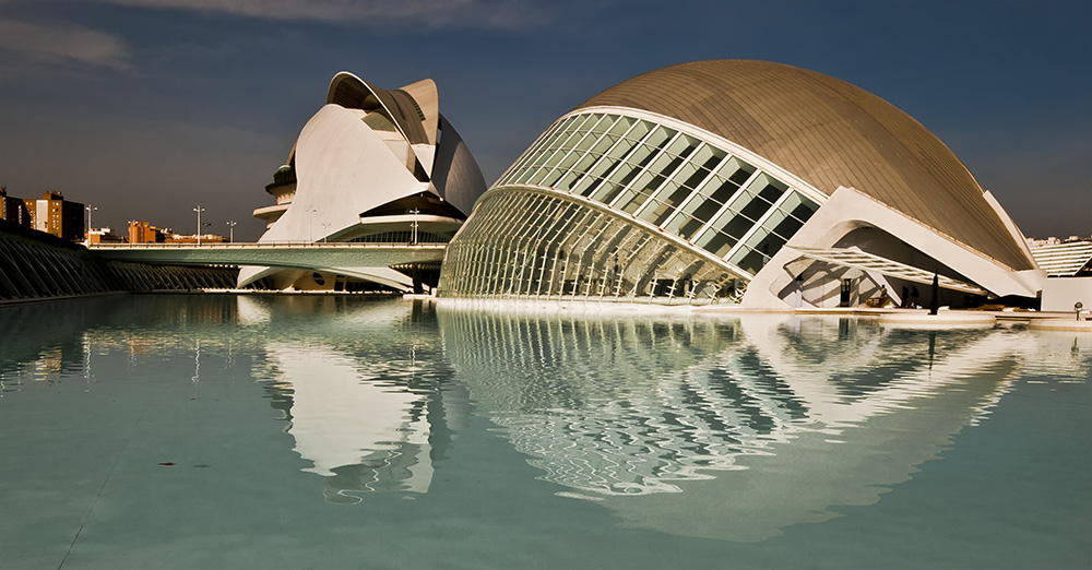 Vista de dos de los más importantes edificios de la Ciudad de las Artes y las Ciencias de Valencia: el Hemisfèric, en primer término, y el el Palacio de las Artes Reina Sofía, tras él, reflejados en el estanque que se halla frente al Museo de las Ciencias. El conjunto, diseñado por Santiago Calatrava, fue inaugurado en diferentes fechas. Curiosamente, los aquí mostrados fueron el primero (1998, el Hemisfèric) y el último (2005, el Palacio). Mínima edición