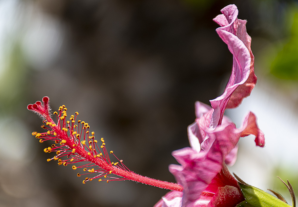De esta flor ornamental me gusta su colorido y su forma, pero lo que me llamó siempre mucho la atención es lo desproporcionadamente largo que tiene el tallo estaminal (donde se hallan los estambres), y lo sobresaliente de su estructura con respecto al "cogollo" de las hojas de la flor. En esta foto se quiso primar justo esa disimilitud, confrontando ambas partes de perfil. Mínima edición
