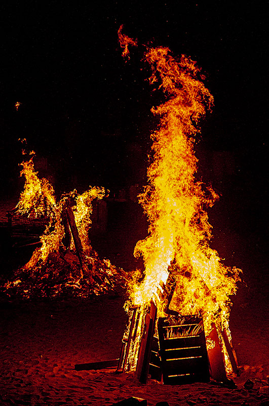La noche de San Juan en La Coruña se celebra en la playa de Riazor y del Orzán, con cientos de hogueras como éstas en las que cada grupo, habiendo previamente reservado su sitio, quema de todo. Con anterioridad, la comida cobra el protagonismo que siempre tiene lugar en Galicia. Al final, todo arde en una noche que, si se da bien, puede ser mágica. Mínima edición