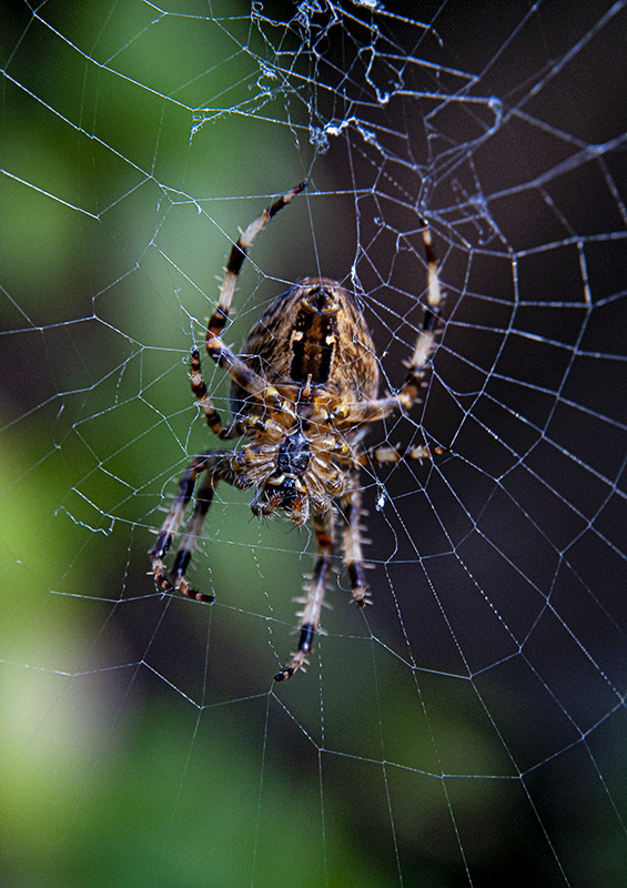 Las telas de araña suelen mostrar un conjunto de ritmos lineales de asombrosa perfección, a veces con el añadido de las gotitas de rocío adheridas a los hilos. Pero en esta ocasión, una presa en su intento de escapar dejó dañada la perfecta retícula de su trampa, por lo que su hacedora debe repararla con urgencia si quiere que cumpla su función. Mínima edición