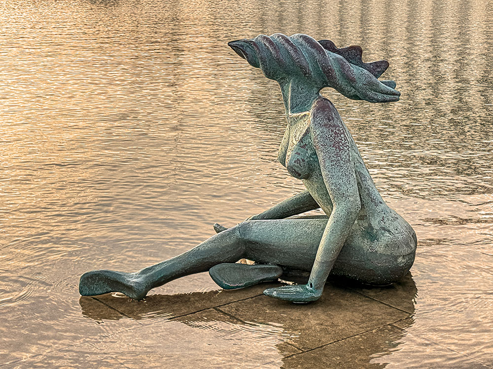 No es una sirena. Es una escultura con formas femeninas, pero que no representa una mujer ni una sirena. Es algo extraño, algo inquietante. Pero ahora la hemos visto en una posición (dentro del agua del puerto de la Marina) mucho más aprovechable y hermoso que la última vez que estuvimos, pues antes se hallaba sobre el borde del muelle. Sigue siendo impactante, pero ahora las posibilidades estéticas, inmersa en el agua aumentan muchísimo. No me ha sido fácil encontrar información sobre ella. En la edición, añadí calidez de atardecer al agua a una imagen captada al mediodía