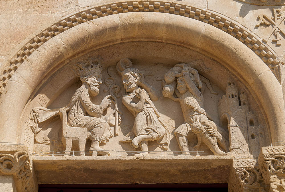 La iglesia de Sta. Fe de Morlaas es sorprendente por un doble motivo. De la iglesia original del s. XII sólo queda la fachada, pero ésta, además, guarda otra originalidad: y es un tímpano doble enmarcado bajo las seis imponentes arquivoltas, del que aquí se muestra la parte izquierda, que tampoco es muy habitual con su temática, como es la Matanza de los Inocentes. Con gran economía de medios, como es habitual en el románico, sólo el rey Herodes, dos esbirros y tres niños portados por uno de ellos. Aunque lo más dramático sea la mano que surge e la edificación intentando que no se lleven al niño inferior. Mínima edición