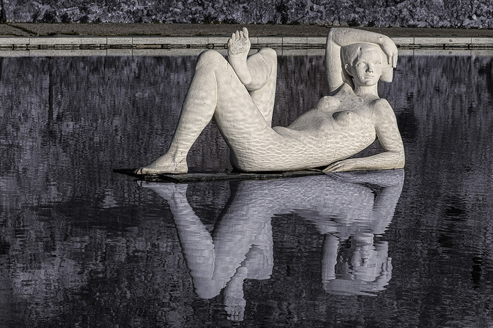 Esta ninfa de piedra no demasiado fina se ubica en el centro del estanque llamado Espelho D'Água, frente al fuerte de Santa Catarina, y es famoso por sus reflejos, al tener el agua muy poca profundidad. No he logrado hallar la autoría de la escultura, cuya relajada postura imitan los turistas en sus fotos. Se editó la foto en dos zonas: todo lo que tuviera que ver con el agua y sus reflejos con un virado azulado suave, por un lado, y el resto por otro