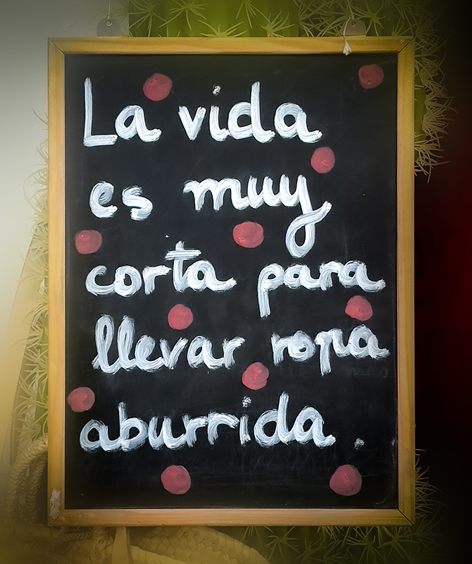 Cartel que servía como reclamo en una tienda de ropa moderna y algo rompedora. Me captó la atención la buena disposición de las letras, bien caligrafiadas. Y el mensaje, claro. En edición se difuminaron los bordes del marco para que no distrajesen el mensaje principal