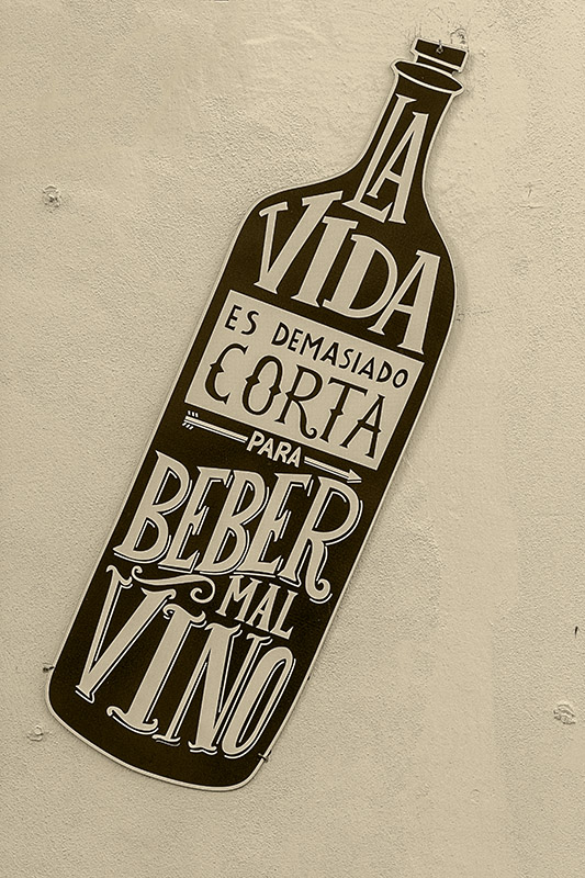 Este grafiti de un establecimiento cordobés publicitaba una marca de vino, pero a mí lo que me interesó fue el mensaje. Centrada en la paradoja, la frase es demoledora. No implica que lo contrario sea una verdad absoluta, es decir que si se bebe buen vino la vida se alargue, pero sin duda se vivirá mejor y disfrutando más, que es de lo que se trata en definitiva. Mínima edición