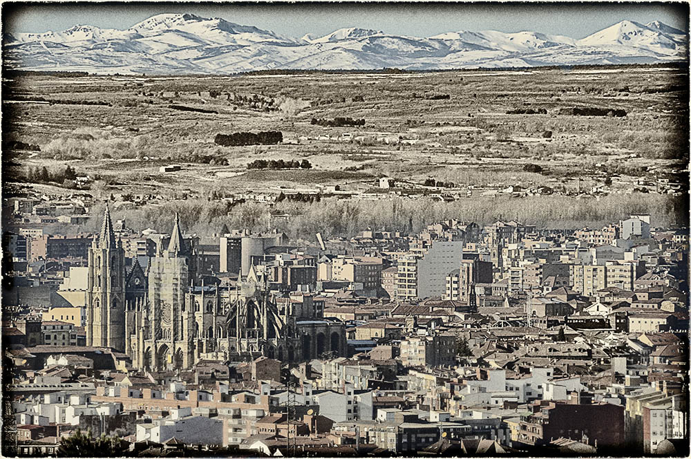 Tomada con teleobjetivo, la perspectiva se comprime, y de ese modo parece que los tres planos (ciudad, campiña y montaña) están pegaditos, cuando lo cierto es que los picos de la Cantábrica (bien cubiertos de nieve) están a más de 50 km. La foto se ha desaturado por partes y virado en otras para darle un toque más intemporal