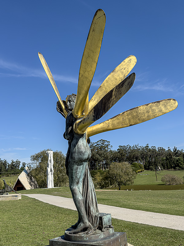 En el impresionante Museo de Arte Contemporáneo Atchugarry (MACA), no sólo se halla una amplia selección de su extraordinaria obra, sino también un puñado de esculturas de artistas considerados importantes para él. Entre ellas, me llamó la atención esta recreación de la Venus saliendo del baño, de Praxíteles, combinada con unas alas que simulan las de una libélula que titula la obra, aunque sean de metal y, acaso, impidieran su vuelo grácil. Es obra del escultor francés Arman Fernández, realizada en 1996. Al fondo, la Capilla del recinto, y otra escultura de Atchugarry. Mínima edición