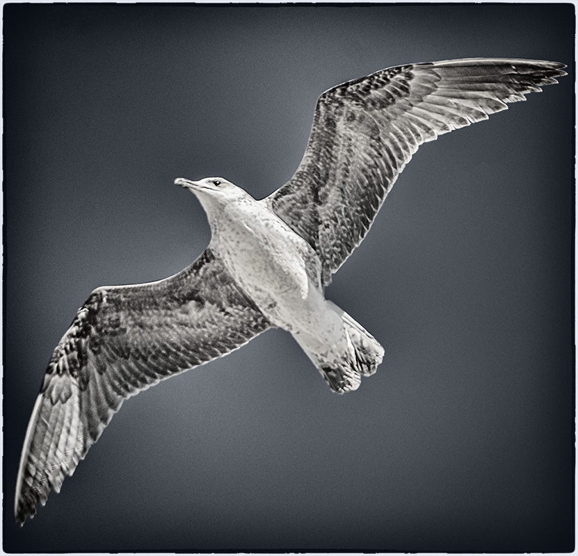 Fotografía de gaviota recortada de un modo algo antinatural. El motivo es que su nitidez y detalle eran aceptables, pero había quedado en la parte izquierda del fotograma, sin posibilidad decente de reencuadrarla bien. Así, el formato cuadrado se ajusta a la diagonal de sus alas, aun forzadamente. La desaturación y el virado posterior enfatizan el detalle del plumaje. Laboriosa edición, esta vez