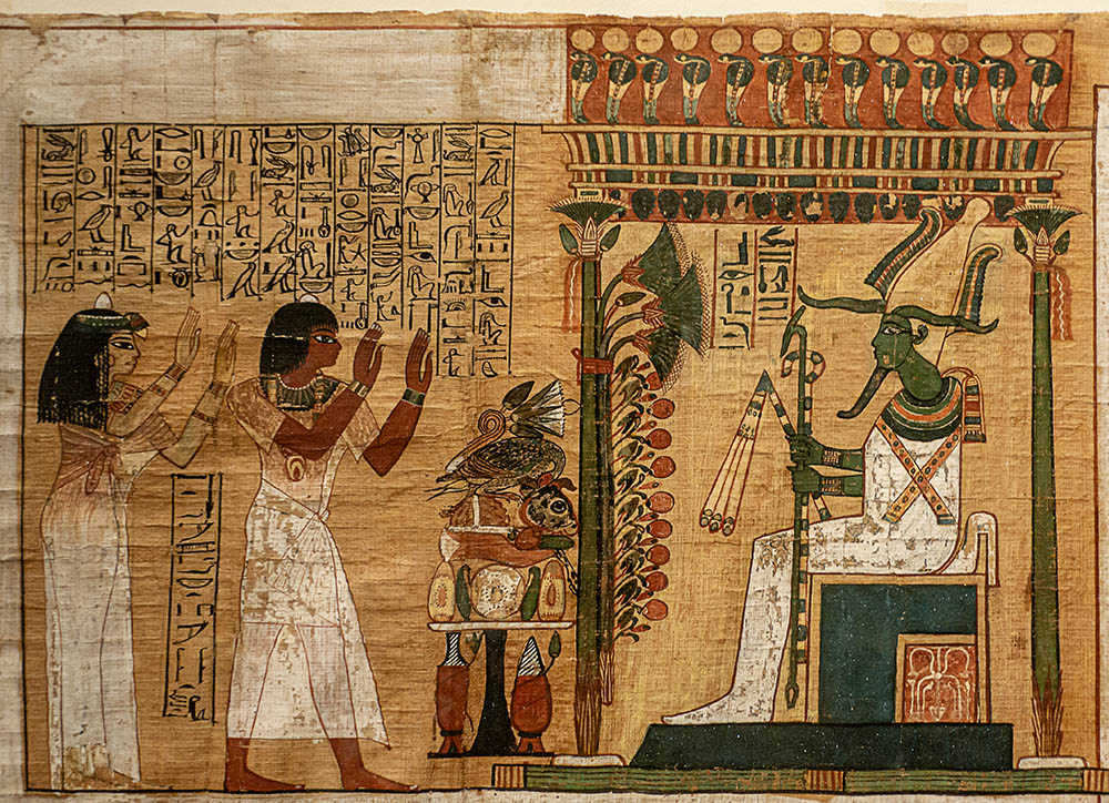 La colección de piezas del Museo Egipcio de Turín es excepcional por muchos motivos; lo es también por la variedad de elementos expuestos, que a veces incluyen ajuares enteros de tumbas aparentemente menores, pero muy reveladoras de lo que supuso la cultura egipcia en general y en particular. En este caso, se muestra un papiro de uno de tantos Libros de los Muertos que toda tumba debía albergar. En él, el dios Osiris aguarda a la derecha las almas de los dos muertos, tras haberse realizado el Juicio con anterioridad. Mínima edición
