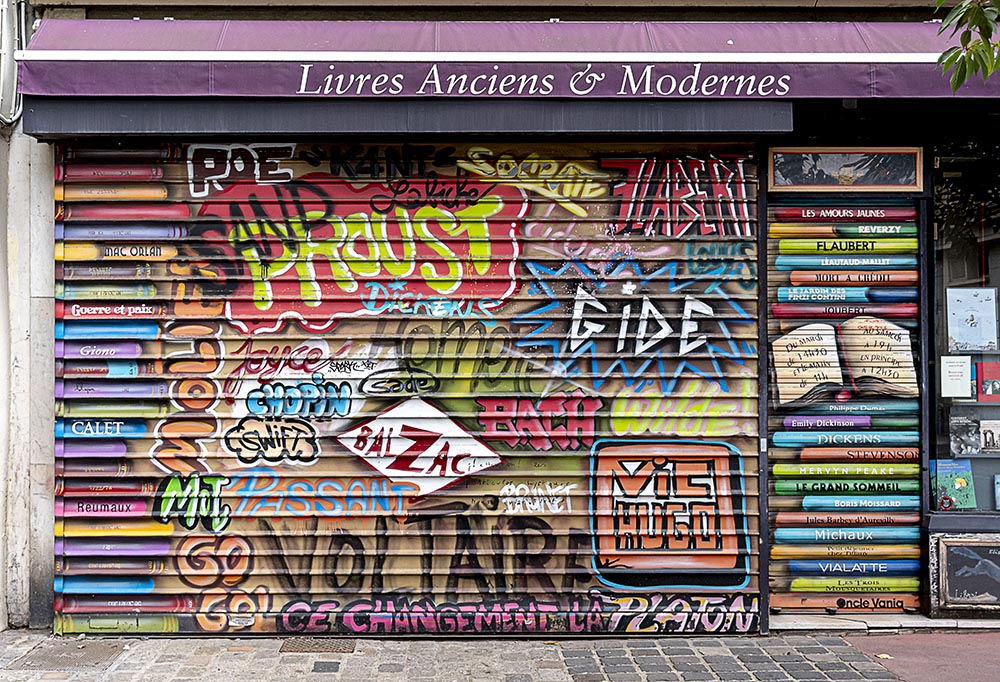A pesar de tener la trapa bajada, esta librería de lance que se hallaba en la capital normanda llamó poderosamente mi atención, suscitó unos cuantos disparos y encendió un rato mi imaginación para adivinar qué tesoros no llegarían a acumularse en su interior. Con todo, la deliciosa forma de decorar algo tan poco bello como una trapa metálica, me hizo pensar en las múltiples maravillas que hube de perderme por necesidades ajenas a mi voluntad. Mínima edición