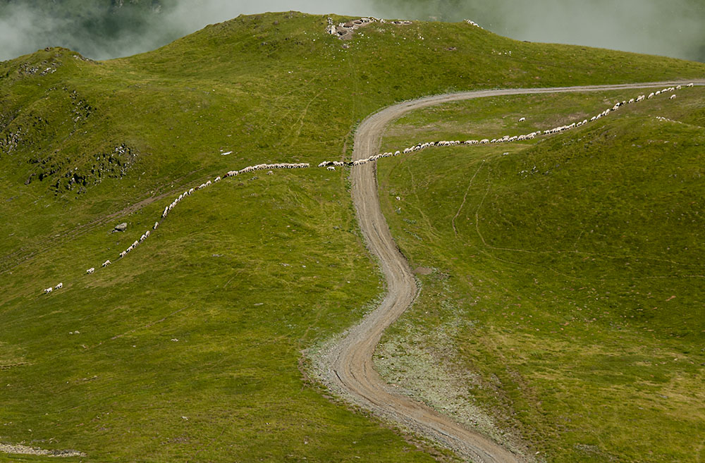 Entre las espectaculares vistas que ofrece la subida a una de las cimas del pirineo francés, me llamó la atención ésta, por lo inusual: una hilera de disciplinadas ovejas intersecta con un camino de montaña, formando una curiosa composición, con el marco verde de fondo de contraste. Mínima edición