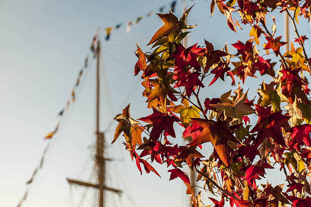 Pese a ser agosto, este liquidámbar decidió que sus hojas verdes debían iniciar el tránsito hacia tonos más cálidos, aun sintiéndose todavía el verano. Cosas de la biología. Coincidió con la visita al puerto de Avilés del buque-escuela de la armada portuguesa, el velero Creoulaun velero portugués, dos de cuyos mástiles con gallardetes se ven detrás. Mínima edición