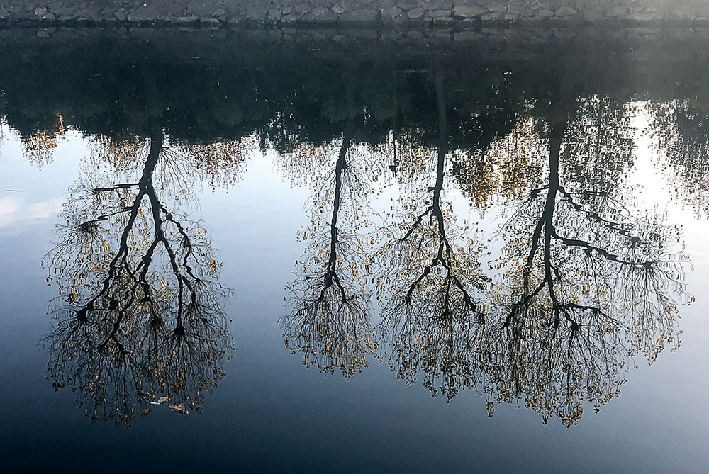 A veces, lo interesante no está en lo que vemos mirando hacia arriba, sino hacia abajo; y si encima hay reflejo en el agua, lo que percibimos cambia. Esa es la esencia de esta imagen. Ver los árboles desde otra perspectiva, con otra nitidez, con otra disposición: de otro modo, vaya. Mínima edición