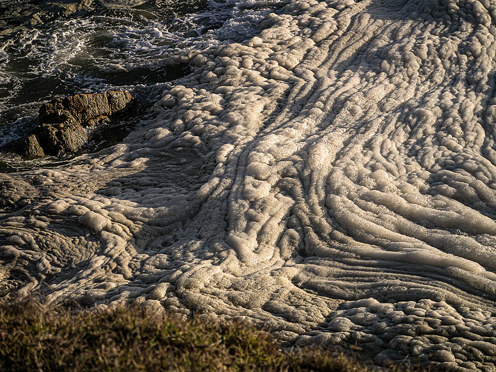 En ocasiones especiales, el movimiento del oleaje contra las rocas costeras origina un batido que, si es acompañado de otros elementos coadyuvantes (materia orgánica en suspensión, temperatura del agua, entre otras), genera una espuma cuyas burbujas se generan con mayor rapidez de la que origina su desaparición, por lo que ésta se acumula y adensa, originando un manto sorprendente, que a veces genera composiciones curiosas. Si además la luz es rasante propia del crepúsculo, las sombras dan una textura inigualable a la imagen. Mínima edición