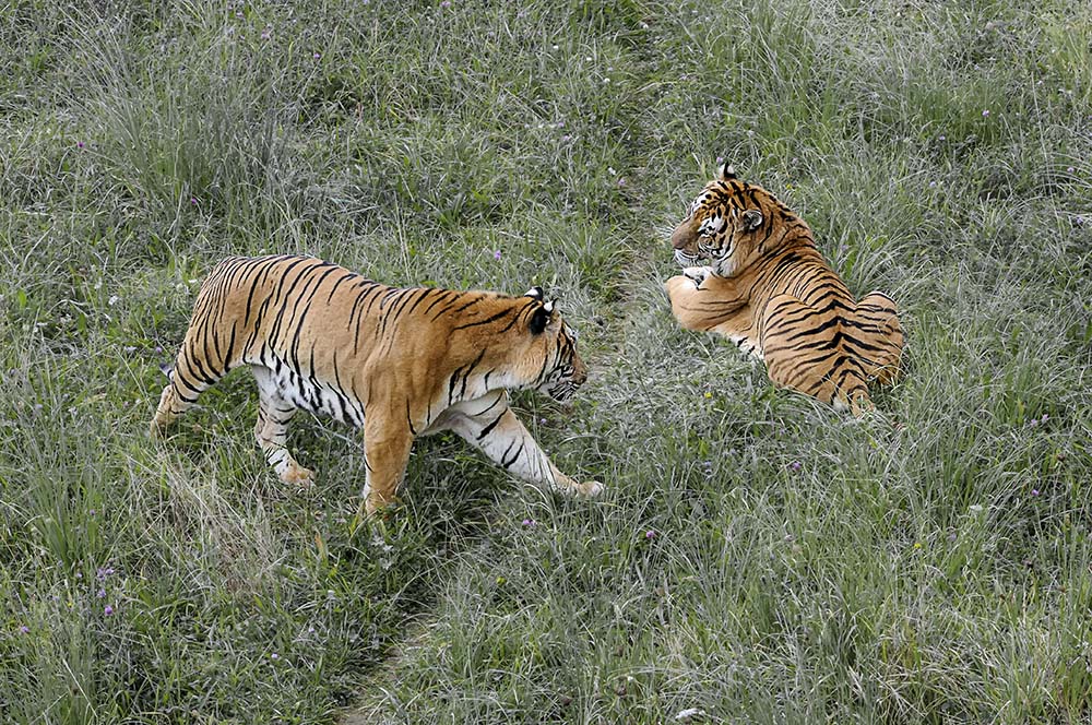 Son un macho y una hembra de trigres de Bengala. Se conocen muy bien, puesto que pasan juntos todo el tiempo. Aun así, cuando los cuerpos se aproximan, el instinto marca poner atención para que el enemigo potencial no sobrepase cierta distancia de seguridad. Las miradas no dejan lugar a error alguno. Se desaturó algo la vegetación a la hora de editar, para que el naranja de sus pelajes destacara másn la edición