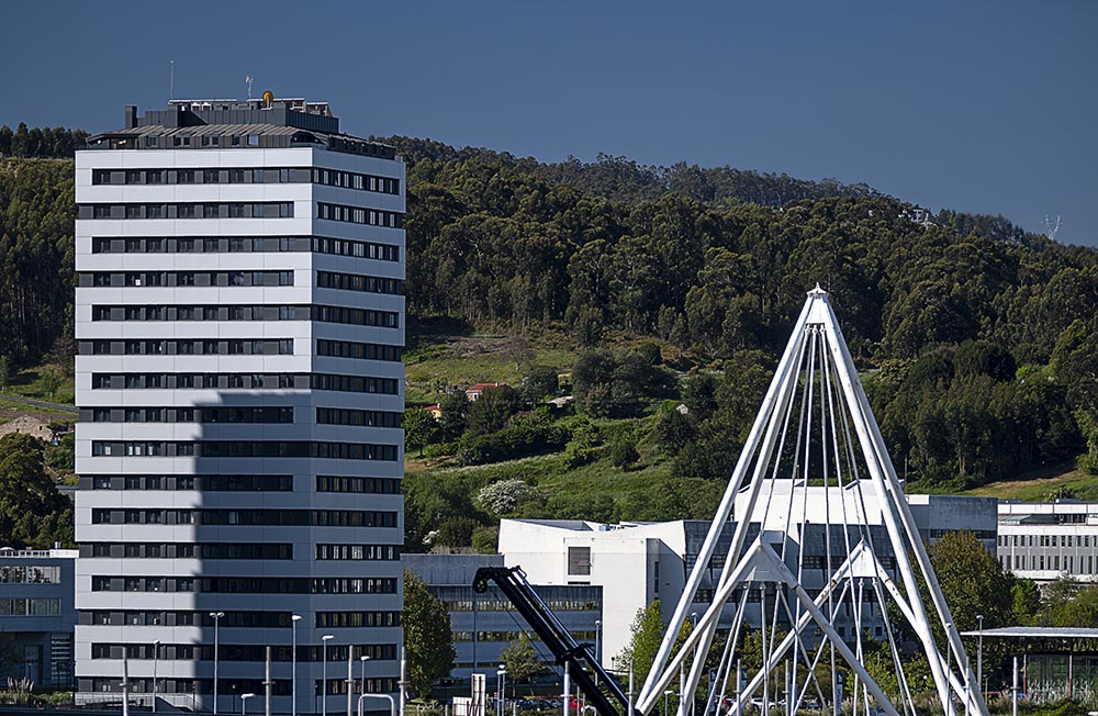 Edificio y rotonda atirantada de moderno diseño, cercanos al complejo de La Coruña Espacio, en la zona de salida de la capital coruñesa. El monte y el verde, en cambio, siempre están muy cerca, Mïnima edición