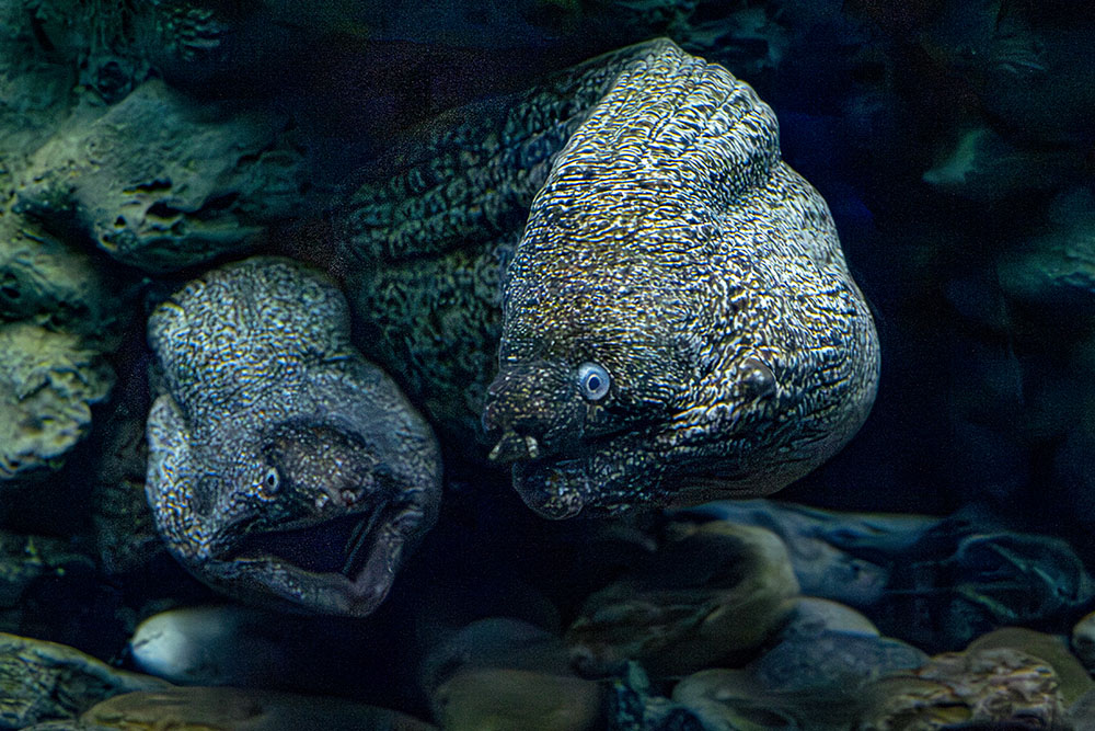 Por lo común, suelen verse siempre morenas en los acuarios, tanto pequeños como grandes. Y dentro del mismo estanque, también había visto las evoluciones de más de una. Pero lo que aún no había visto era una pareja de morenas que estuvieran una al lado de la otra. Su particular fisonomía facial, que las hace parecer agresivas y dignas de ser temidas, en este caso se trueca por una expresión como de preocupación, como si tuvieran temor mientras defendían su guarida de los visitantes. De ahí mi interés, y de ahí que hoy las haga aparecer aquí para público conocimiento del respetable. Mínima edición
