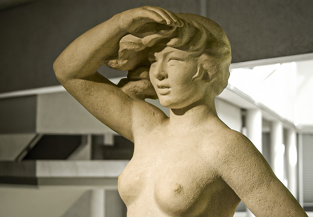 Escultura en piedra arenisca de Juan Luis Vasallo, de 1948, que recreó así el mito de la diosa Gades. La foto está realizada en el espléndido Museo de Cádiz, en su sección de arte contemporáneo. Sus formas y su factura sobre piedra me recuerdan las de Arístides Maillol, pero no podría asegurarlo. Sí parece una obra a caballo entre fines del XIX y el XX. Es un desnudo integral, del que aquí sólo se muestra la parte superior, jugando con el contraste de los volúmenes rectilíneos que la rodeaban. En la edición se desaturó justamente ese fondo