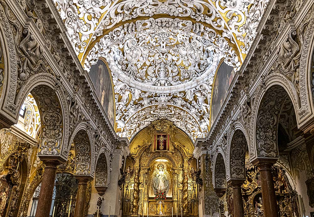 La decoración barroca de la iglesia sevillana de Sta. María la Blanca fue realizada por los hermanos Pedro y Miguel de Borja a mediados del XVII. Son yeserías que aportan algo de dinamismo a una estructura ortogonal y algo plana. La bóveda es de cañón con falsos lunetos que albergan pinturas, algunas de Murillo. La imagen que figura al fondo es la muy famosa Virgen de las Nieves. Mínima edición