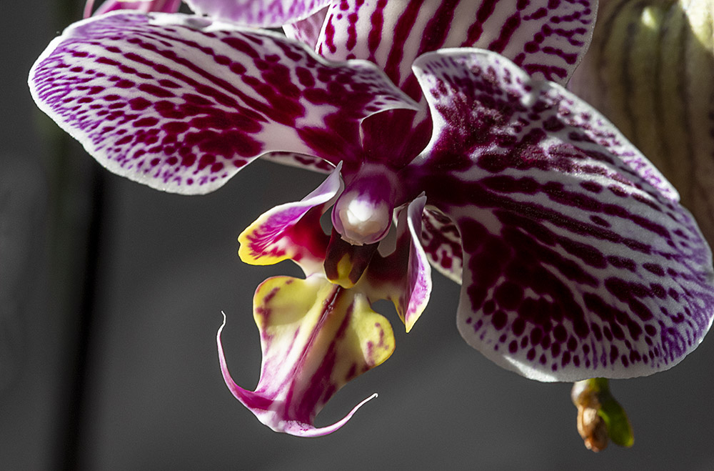 Macrofotografía de una orquídea, iluminada con luz natural lateral, proveniente de una ventana por la que entraba el sol. En la edición se desaturó el fondo y se clonaron unas cuantas motas de polvo, invisibles al ojo en circunstancias normales