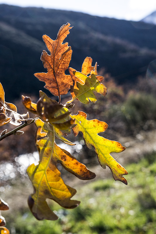 Al lado del embalse de Barrios de Luna, y aprovechando la luz frontal que permite captar el carácter semi-traslúcido de las hojas, generando una aproximación a un contraluz que deja bien evidente las hojas otoñales de este roble que se hallaba al lado de la carretera que conduce hacia Babia y las Omañas. Mínima edición