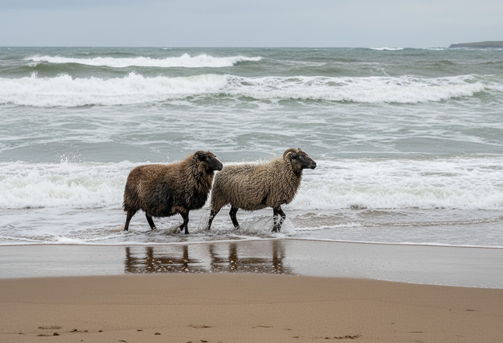 Es una foto bien rara, ¿no? Lo de las ovejas, pase, pero ¿al lado del mar y chapoteando entre olas? No parece normal. Y no lo es. Sin embargo, las ovejas son islandesas, omnipresentes por doquier, y campando a sus anchas, carreteras incluidas, con sus cuernos tanto para machos como para hembras. La playa y los acantilados también lo son. Pero la imagen resultante es un producto de la IA, que consigue mezclar ambas imágenes con el suficiente verismo como para que hasta las patas parezcan salpicadas de agua y espuma. En fin, nuevos tiempos