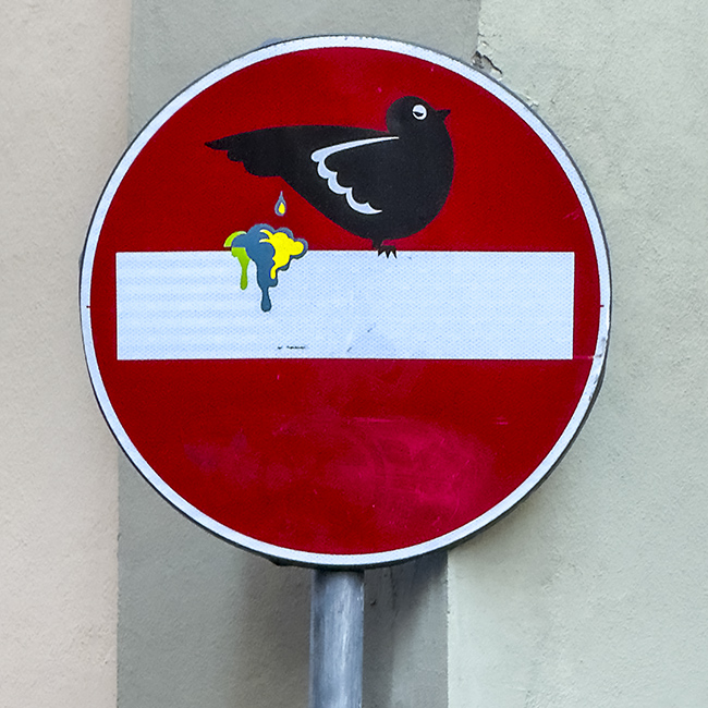 No sé si es una iniciativa municipal, porque vimos varias idénticas (y con otros motivos igualmente humorísticos), o es cosa de ciertos colectivos con ganas de coña. El caso es que unas cuantas señales de este tipo que vimos en Florencia mostraban esta hilarante. muestra de "arte" urbano. Mínima edición