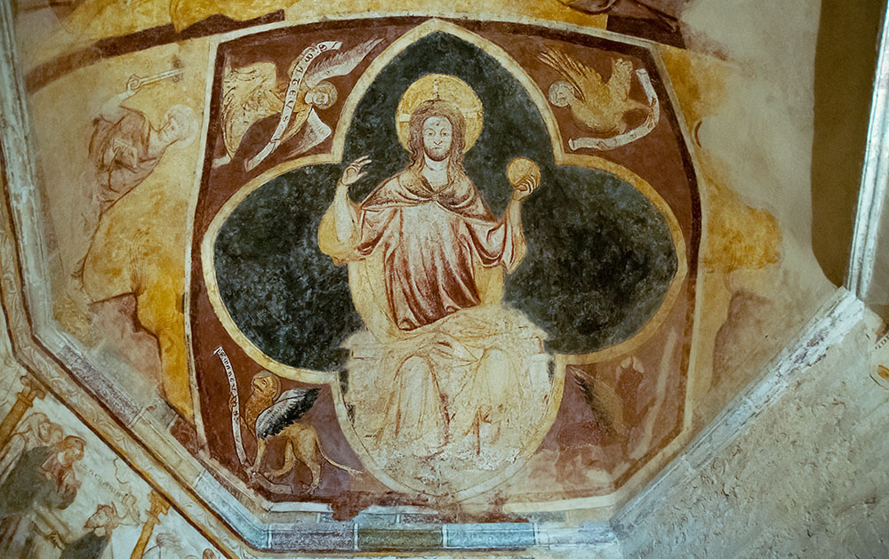 Esta pintura al fresco representa a un pantocrátor con su tetramorfos, inscrito en una mandorla tetralobulada, con los atributos y apariencia propios del románico, aunque precisamente la forma de la mandorla y el detalle del rostro apuntan a una época ya gótica. Las informaciones hablan de una cronología del XII al XIV, pero no he podido hallar mayor precisión. Participan dichas pinturas, pues, de rasgos de los dos principales estilos de la Edad Media occidental. Mínima edición