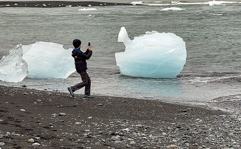 En medio de un espectáculo de miríadas de fragmentos de hielo blancoazulado sobre una arena negra, donde era difícil detenerse en otra cosa que no fuera buscar las mejores composiciones entre dichos elementos, reparamos en este chiquillo, que portando un móvil no dejaba de moverse de un lado para otro. Era un frenesí. Ningún encuadre parecía satisfacer su infatigable ansia por lograr su perfección. Nos dejó anonadados. Por un momento, quise ser él, joven, con una cámara que llevar siempre encima, y toda una vida por delante. Fue muy hermoso. Mínima edición