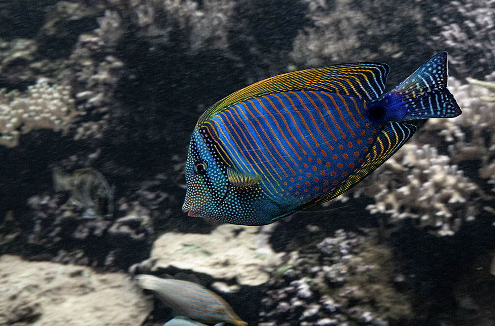 Ejemplar de pez tropical solitario, en Oceanópolis, el enorme museo oceanográfico bretón. En la edición, se dio relevancia absoluta al pez (tanto en enfoque, saturación de color, brillo), y con el fondo se procedió en sentido contrario