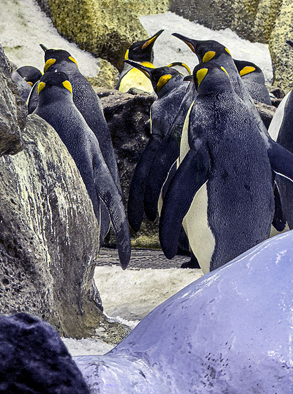 l zoológico tinerfeño de LoroParque alberga una comunidad numerosa de pingüinos, en una estancia que es la más grande de cuantas yo he llegado a ver en recintos de este tipo. En ellos, es habitual ver pingüinos rey, pero no en tan elevado número. Con una altura que oscila entre los 70 y los 95 centímetros, sólo es superado en tamaño por el pingüino emperador, que no suele estar presente en este tipo de zoológicos. En la edición se eliminaron las cintas y anillas de su marcado, así como se equilibró la temperatura de las luces, para dar un tono más natural a la imagen