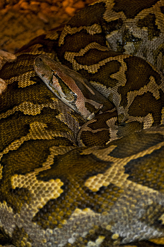 Este ejemplar adulto de pitón hindú (Python molurus molurus) alcanzaba los cinco metros y medio, aunque puede llegar a medir un metro más. Ejemplar en peligro de extinción, se alimenta de pequeños mamíferos, aves y anfibios, a los que detecta por unos sensores termosensibles, incluso en la oscuridad. Como todos los representantes de la familia de los boidos, muerde -sin veneno- para asegurar la pieza, se enrosca sobre la víctima y la mata por constricción de sus anillos. Mínima edición