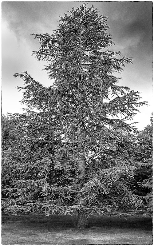 Al lado del famoso pozo -con gruta- (Gouffre de Padirac), se levantaban unas cuantas coníferas, entre las que destacaba por altura y porte este cedro. La foto se pasó al B/N para remarcar las texturas y los grises del cielo