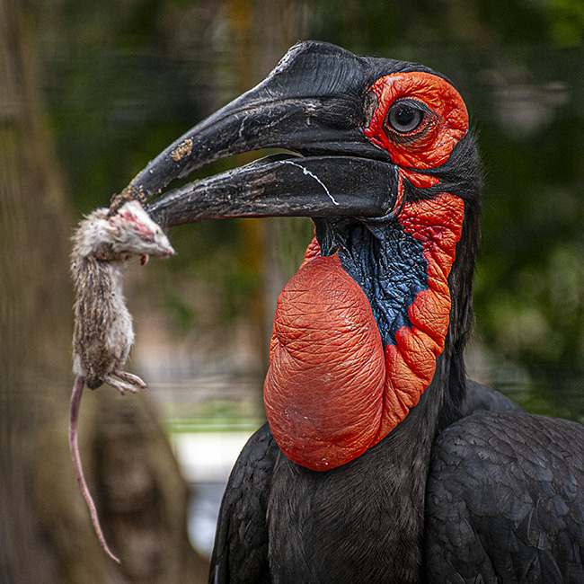 Este cálao terrestre no tuvo problema en posar con tranquilidad con el alimento que los cuidadores le habían suministrado instantes antes. Parecía entender la situación, incluso cambió de posición para que yo me deleitase probando mejores encuadres. Su intenso colorido y la fuerza de su mirada compensan su (sólo aparente) fealdad. Mínima edición